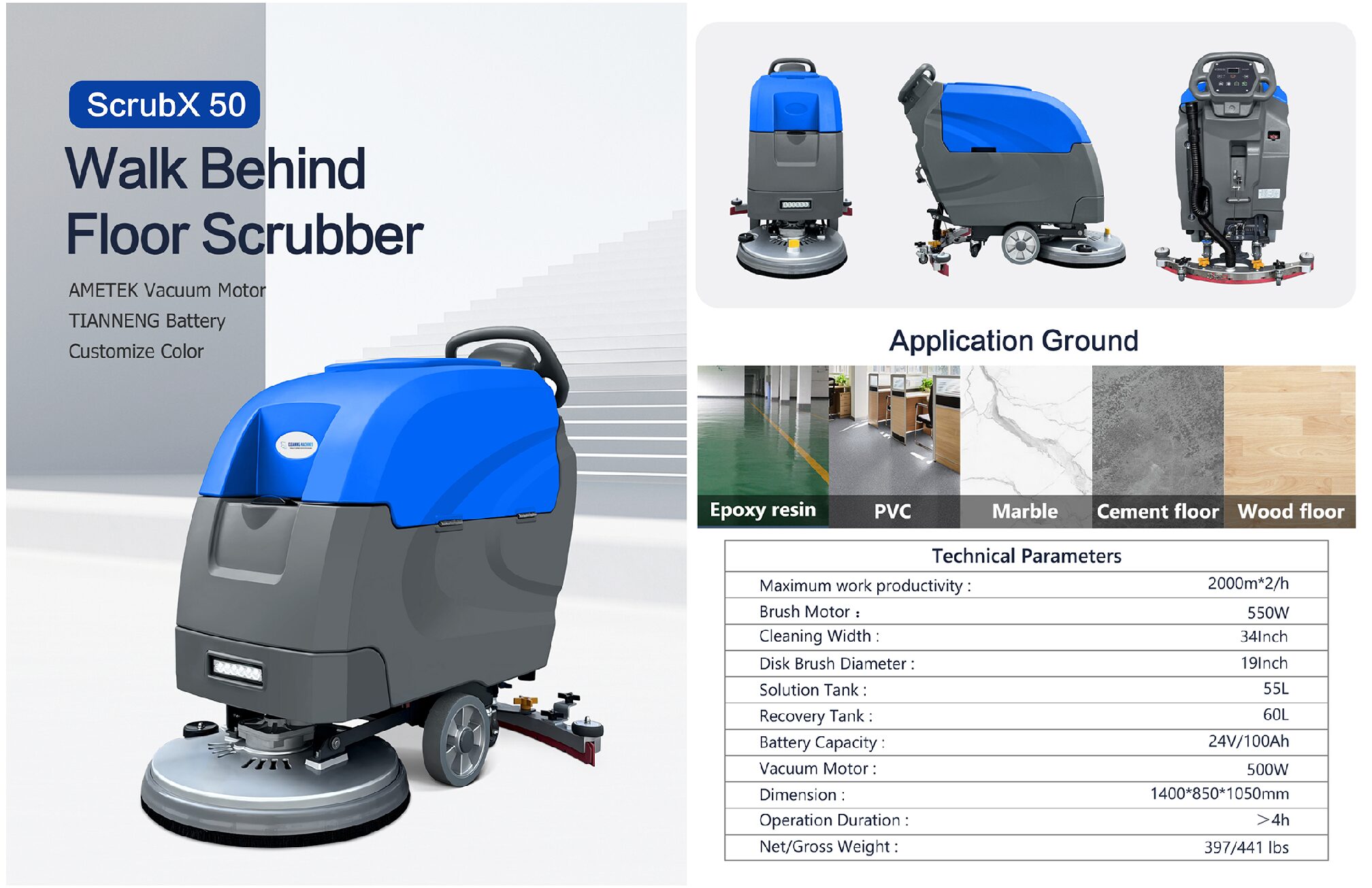 Equipped with a robust 24V 100Ah battery system, the ScrubX 50 delivers extended runtime—allowing long cleaning sessions without frequent recharging. Its large-capacity solution and recovery tanks minimize refills, while the ergonomic handle ensures comfort and control during operation. Built for durability and performance, the ScrubX 50 is ideal for heavy-duty use in warehouses, malls, hospitals, and industrial facilities where efficiency and reliability matter most.