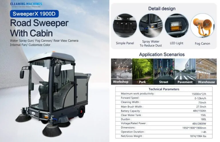 Experience industrial-level cleaning power with the SweeperX 1900D, a high-performance ride-on road sweeper built for large outdoor and indoor cleaning operations across Canada. Designed for municipalities, factories, warehouses, and parking facilities, this heavy-duty machine ensures maximum productivity with exceptional dust control and operator comfort.
